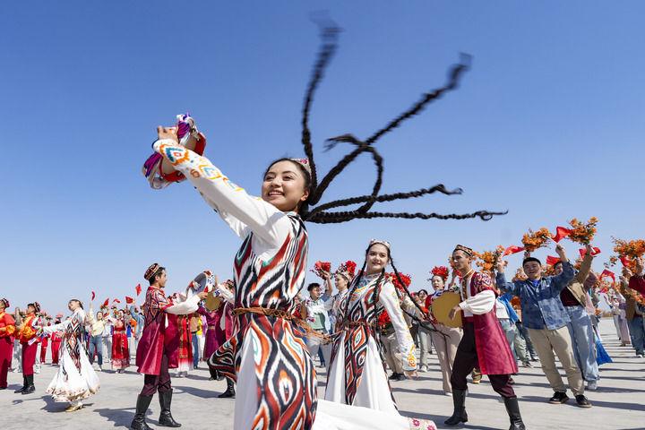 2025年9月23日下午,群众载歌载舞,喜迎新疆维吾尔自治区成立70周年。新华社记者 毕晓洋 摄
