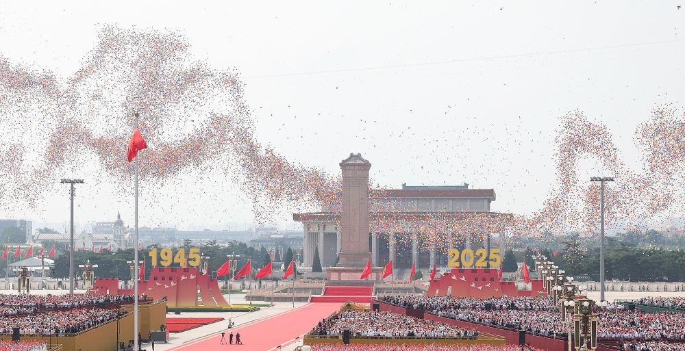 2025年9月3日,纪念中国人民抗日战争暨世界反法西斯战争胜利80周年大会在北京隆重举行。这是纪念大会现场放飞和平鸽和气球。新华社记者 姚大伟 摄