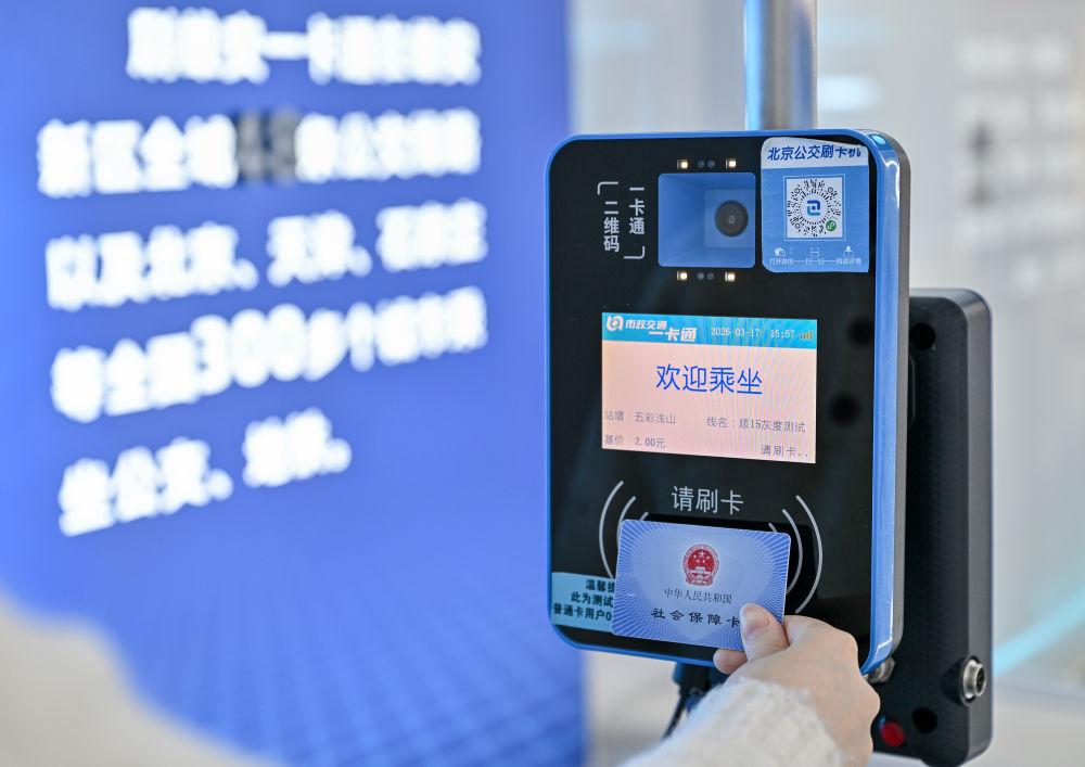 2026年3月17日,雄安一卡通体验馆的工作人员演示刷社保卡乘坐公交车。
