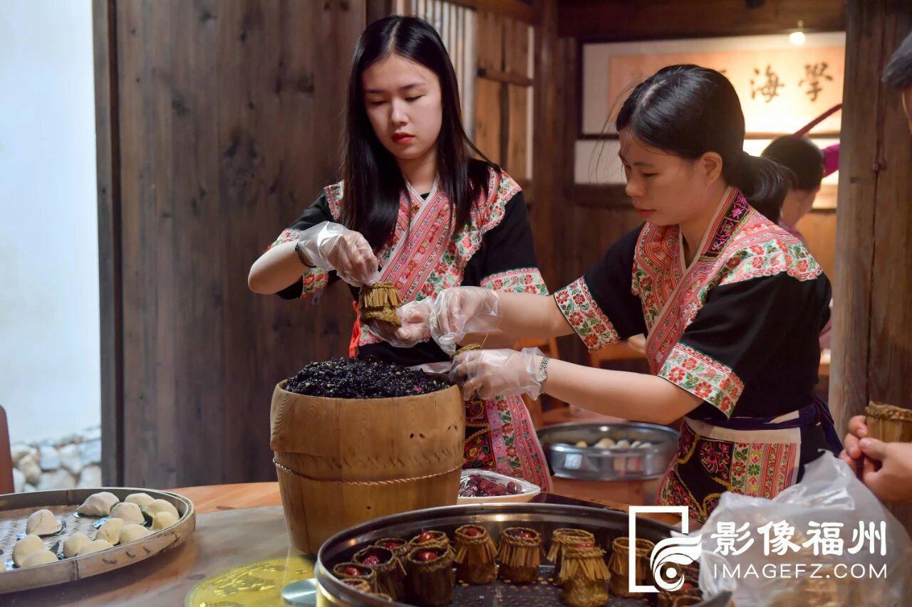 畲族美食有三宝,乌饭、红曲酒、五节粽,每一样都藏着畲乡的饮食智慧与美好寓意。乌饭由乌稔树的绿色树叶捣汁泡制糯米蒸制而成,口感软糯且带着草木清香,有开脾健胃、祛湿的作用。红曲酒是以罗源冬粟糯米为基底,搭配畲族特制红曲与山泉水酿造而成的一种黄酒,酿造技艺为福州市级非遗。五节粽又称“枕头粽”,以菅草叶包成别致的枕头状,再用粽叶丝捆扎出五节,寓意“五月节得五福”。