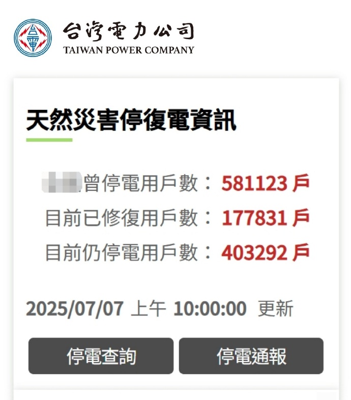 据台当局“灾变中心”统计,此次台风截至7日上午8时,已造成2人死亡。另据台湾电力公司公布,截至7日上午10时,台风造成全台累计58.1万余户停电,仍有40万余户待修复供电。