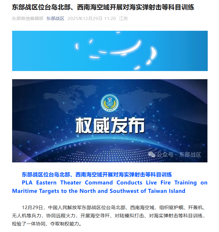 12月29日,中国人民解放军东部战区位台岛北部、西南海空域,组织驱护舰、歼轰机、无人机等兵力,协同远程火力,开展海空寻歼、对陆模拟打击、对海实弹射击等科目训练,检验了一体协同、夺取制权能力。