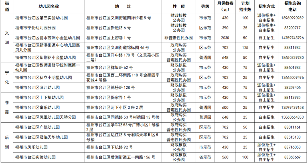 台江区2025年秋季幼儿园招生计划信息表