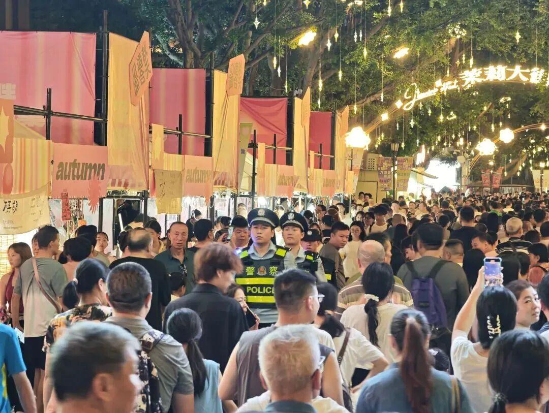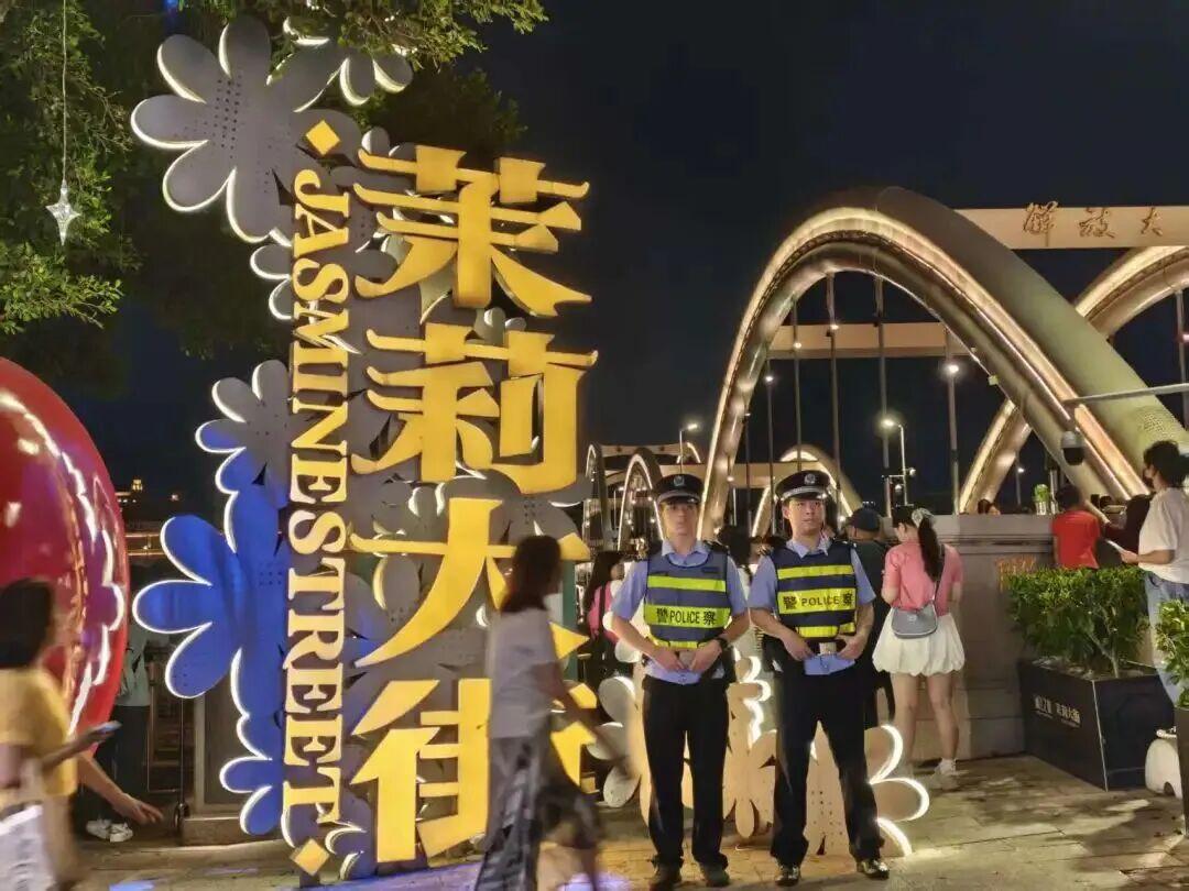 为策应国庆期间辖区大型活动,台江分局打出了“协同防控”组合拳,由属地派出所警力负责核心值守点,周边派出所增援填补巡逻盲区,机关民警下沉一线,与巡特警大队组成“联合巡逻组”,实行“潮汐式守点巡线”。人流高峰时,大家在观景台、出入口手拉手筑起“安全人墙”;人流平缓时,沿着茉莉大街动态巡查,随时回应游客求助。