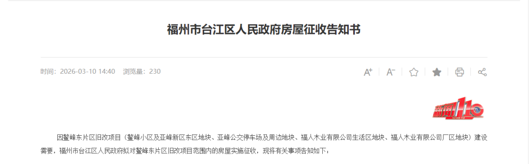 日前,福州市台江区人民政府发布房屋征收告知书,拟对鳌峰东片区旧改项目范围内的房屋实施征收。
